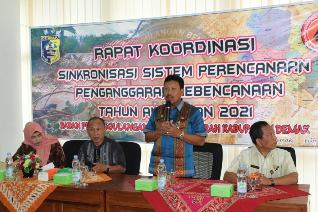 Selasa, 11 Februari 2020. Badan Penanggulangan Bencana Daerah (BPBD) Kabupaten Demak menyelenggarakan Rapat Koordinasi dengan tema “Rakor Sinkronisasi Sistem Perencanaan Penganggaran Kebencanaan Tahun Anggaran 2021” dengan mengundang OPD terkait dan 14 Kecamatan di Kabupaten Demak dengan jumlah personil 50 Orang yang terdiri dari Kesra Bag. Umum, SATPOL PP, KESBANGPOLINMAS, DINSOS P2PA, DINLUTKAN, DINPERKIM, DINPUTARU, DINDIKBUD, DINPERTAN, DINLH, DINHUB, DKK, KEMENAG, 14 KECAMATAN Dan Struktural BPBD Kab. Demak