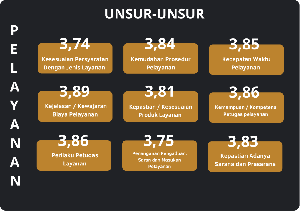 Hasil survei menunjukkan bahwa mayoritas responden merasa cukup puas dengan pelayanan yang diberikan. Beberapa aspek yang paling diapresiasi adalah Kejelasan/ Kewajaran Biaya Pelayanan, Kemampuan/ Kompetensi Petugas Pelayanan, dan Perilaku Petugas Layanan. Walau begitu, masih ada beberapa catatan yang perlu diperhatikan, seperti Kesesuaian Persyaratan Dengan Jenis Layanan, Penanganan Pengaduan, Saran dan Masukan Pelayanan, dan Kepastian / Kesesuaian Produk Layanan.