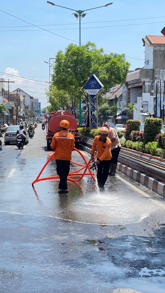 Demak — BPBD Kabupaten Demak bersama Dinas Pemadam Kebakaran (Damkar) bergerak cepat menanggulangi tumpahan solar yang membuat jalan licin di Jalan Raya Demak–Kudus, tepatnya di depan Rutan Demak pada Kamis (25/09/2025).
