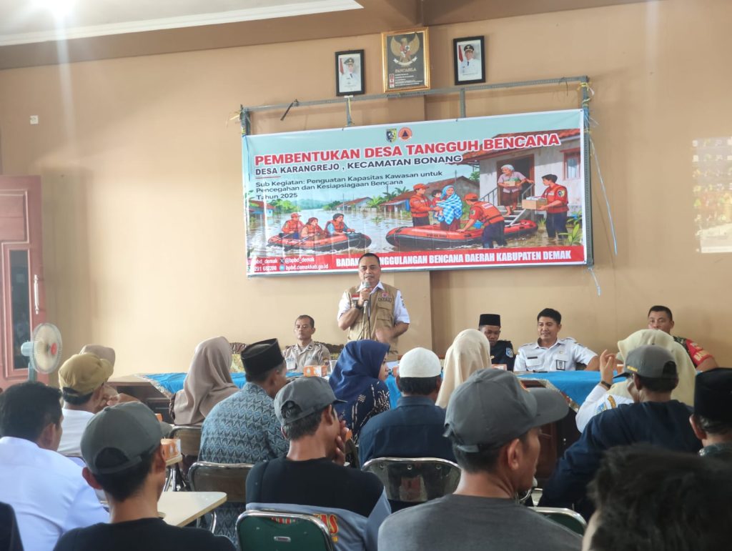 Demak, 15 Oktober 2025 – Badan Penanggulangan Bencana Daerah (BPBD) Kabupaten Demak melaksanakan kegiatan pembentukan Desa Tangguh Bencana (Destana) di Desa Karangrejo, Kecamatan Bonang, pada Rabu, 15 Oktober 2025. Kegiatan ini merupakan upaya untuk meningkatkan kapasitas masyarakat dalam menghadapi potensi bencana di wilayah yang tergolong rawan bencana.