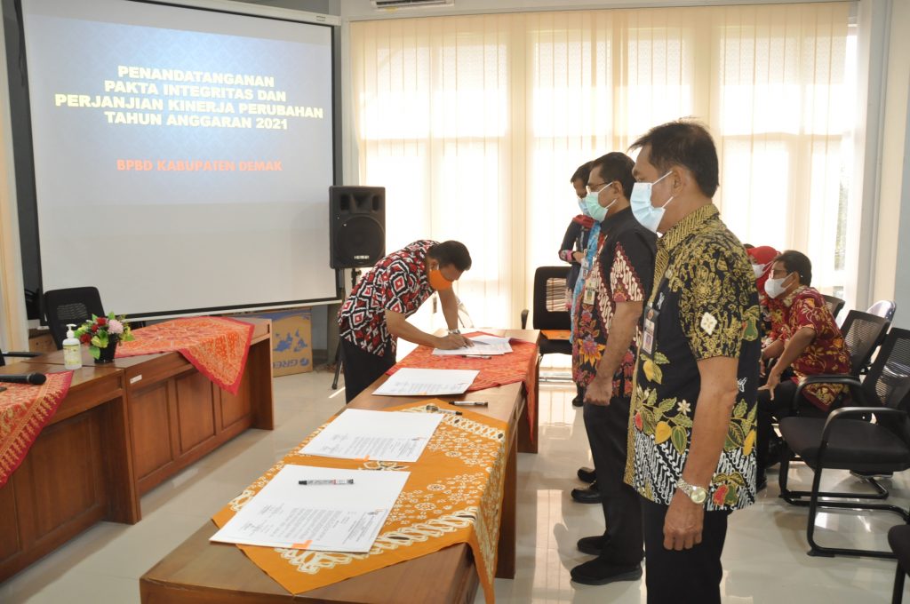 Demak – Seluruh ASN Badan Penanggulangan Bencana Daerah (BPBD) Kabupaten Demak menandatangani Perjanjian Kinerja dan Pakta Integritas Perubahan Anggaran tahun 2021, Kamis (04/11/21) di Ruang…