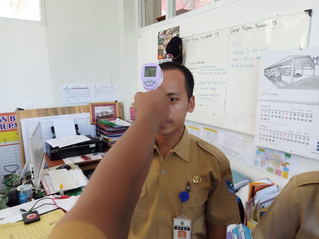 Pengecekan suhu tubuh dengan menggunakan thermal gun (alat pendeteksi suhu tubuh) sudah diterapkan di lingkungan Kantor BPBD Demak, guna mencegah Covid-19 atau virus corona di…